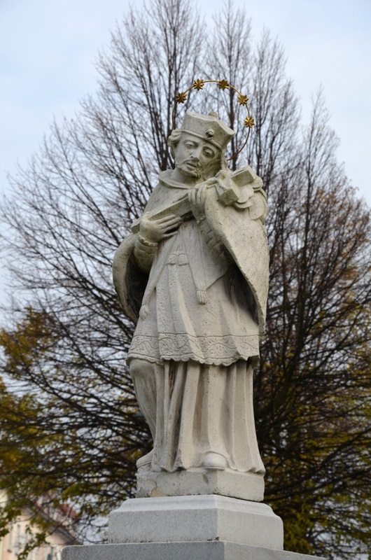 Kamienna rzeźba św, Jana Nepomucena stoi na placu Wolności obok kościoła pw. św. Marii Magdaleny. Figura wieńczy wysoki cokół o ściętych krawędziach. Św. Jan przedstawiony jest w pozycji stojącej, w kontrapoście, ubrany jest w szaty kapłańskie, a nad głową nakrytą biretem umieszczona jest aureola z pięcioma gwiazdami. Święty adoruje krzyż trzymany w rękach przy piersi.