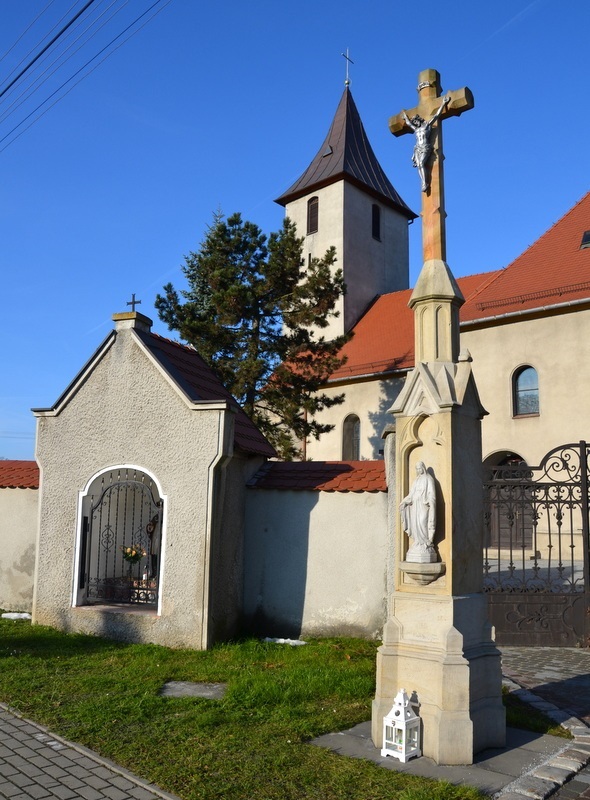 Drugim obiektem jest stojący obok krzyż z figurą ukrzyżowanego Chrystusa. Krzyż wieńczy cokół posadowiony na kilkustopniowej podstawie. W płycinie trzeciej części podstawy wyryta jest praktycznie nieczytelna inskrypcja oraz rok 1884. Cokół mieści profilowaną wnękę zwieńczoną trójlistnym łukiem. We wnęce na kamiennej konsoli stoi figurka MB.