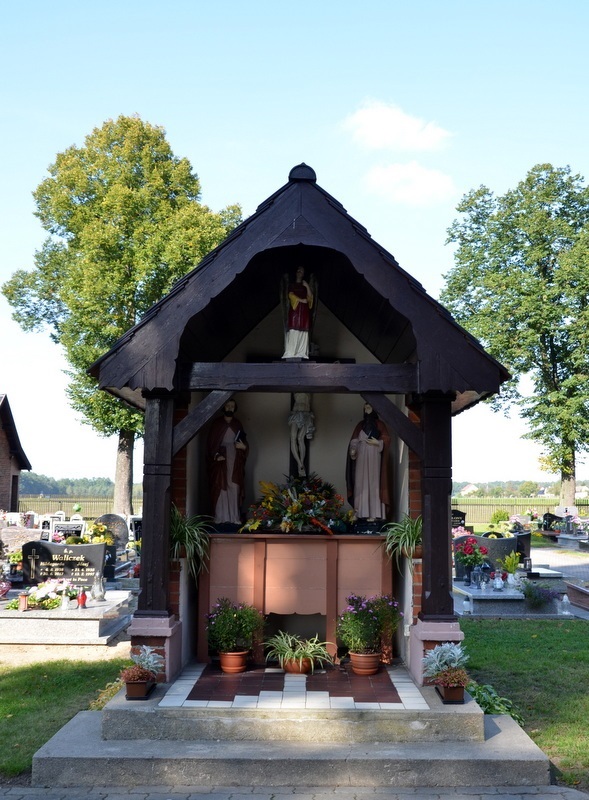 Kapliczka stoi na skraju cmentarza obok kościoła pw. Najświętszego Serca Pana Jezusa. Kapliczka wzniesiona jest na planie prostokąta, murowana z cegieł i częściowo z drewna nakryta jest dwuspadowym dachem krytym dachówką. Wysunięty poza murowane boczne ściany dach wsparty jest na dwóch drewnianych podporach. Przed wejściem do kaplicy pozbawionej frontowej ściany, na poprzecznej belce umieszczona jest figura anioła. Na przyściennym ołtarzu centralne miejsce zajmuje krzyż z figurą ukrzyżowanego Chrystusa. Po obu stronach krzyża stoją dwie figury mężczyzn z książkami przytrzymywanymi przy piersi lewymi rękami ( prawdopodobnie są to postacie apostołów). W bocznych okienkach witraże ze scenami z życia Pana Jezusa.