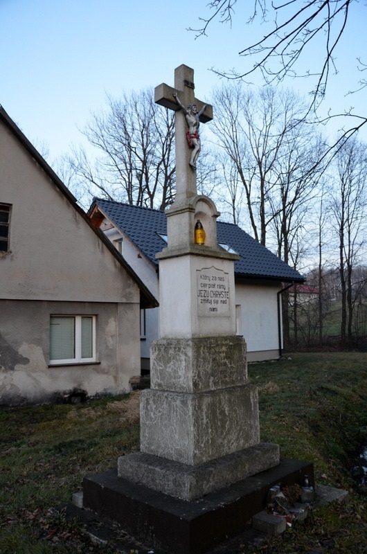 Krzyż znajduje się na skraju ul. Centralnej, nad brzegiem przepływającego strumyka. Podstawa postumentu składa się z pięciu schodkowo ułożonych bloków. Ostatni najwęższy i najwyższy blok zwieńczony jest gzymsem, na którym znajduje się mały cokół. Czwarty blok podstawy posiada wyryty napis fundacyjny " Fundator Jan Joanna Tymon 1937". Na piątym bloku podstawy w płycinie widoczna inskrypcja " Który za nas cierpiał rany JEZU CHRYSTE zmiłuj się na nami". Cokół posiada małą wnękę zamkniętą łukiem z przeznaczeniem na figurkę. Na cokole posadowiony jest prosty krzyż z figurą ukrzyżowanego Chrystusa i poziomym, falowanym kartuszem INRI na szczycie belki.