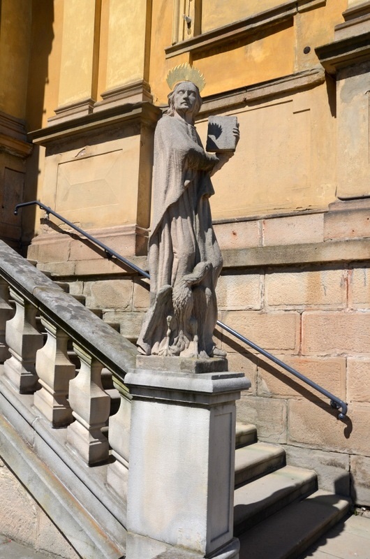 Przy tych ostatnich stopniach na postumentach stoją cztery rzeźby wykonane z piaskowca, są to rzeźby przedstawiające ewangelistów: Marka z lwem, Mateusza z uskrzydlonym człowiekiem, Łukasza z wołem i św. Jan z orłem. Każdy z nich przedstawiony jest z księgą (ewangelią) trzymaną w lewej ręce.