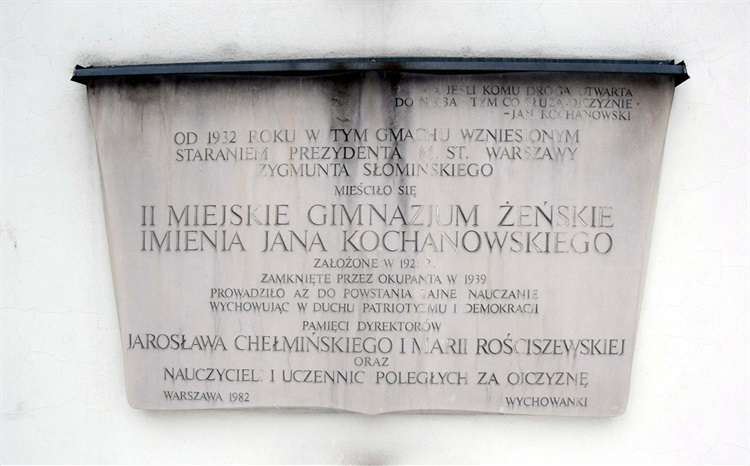 Tablica znajdująca się na ścianie frontowej Warszawskiego Ośrodka Sportu i Rekreacji „Rozbrat”. Odsłonięta z inicjatywy wychowanek w 1982 roku. Upamiętnia istnienie II Miejskiego Gimnazjum Żeńskiego imienia Jana Kochanowskiego, prowadzone tu podczas okupacji niemieckiej tajne nauczanie oraz dyrektorów, nauczycieli i uczennice poległych za Ojczyznę.