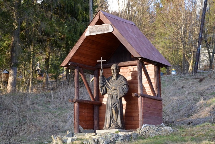 Wewnątrz, na betonowej płycie stoi drewniana rzeźba przedstawiająca świętego Franciszka. Postać ubrana jest w habit benedyktyński, a w uniesionej prawej ręce trzyma krzyż. Nad jego głową znajduje się tabliczka przytwierdzona do połaci dachu, na której wyryta jest dewiza św. Benedykta z Nursji - ORA ET LABORA (módl się i pracuj).