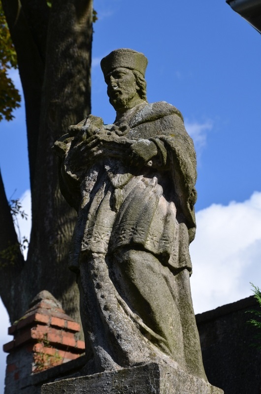 Rzeźba św. Jana Nepomucena stoi przed bramą, po lewej stronie schodów prowadzących na teren kościoła pw. Św. Mikołaja. Figura wieńczy cokół wykonany z czerwonego piaskowca. Postać Jana Nepomucena wykonana z szarego piaskowca datowana jest na XIX wiek. Rzeźba wysokości 120 cm przedstawia świętego w kontrapoście, szatach kapłańskich i krzyżem trzymanym w rękach przy piersi.