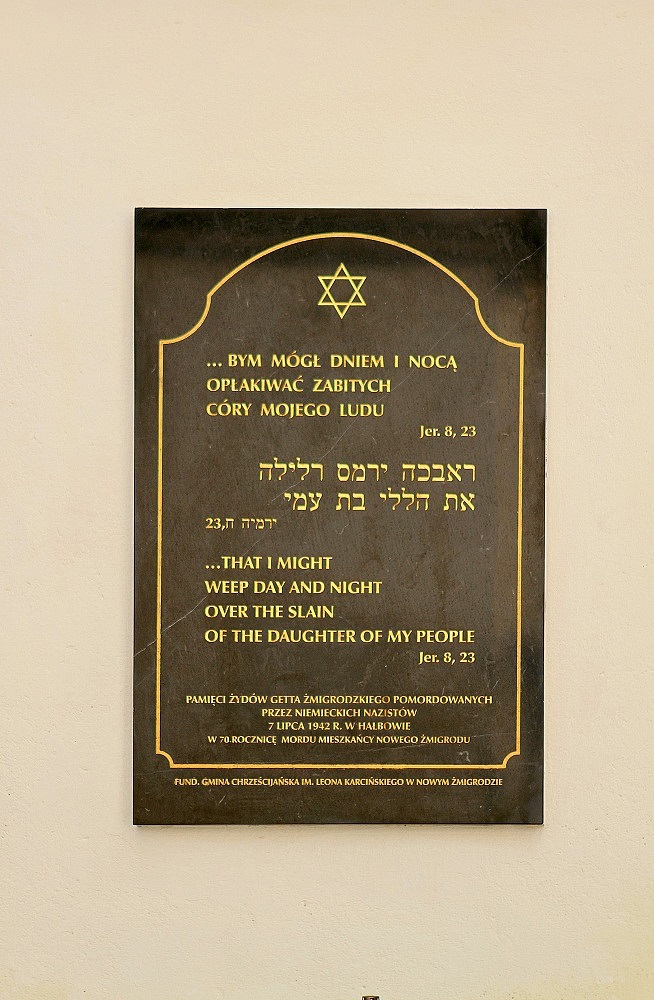 Na ścianie budynku przy ulicy Kościelnej, na przeciwko kościoła pod wezwaniem Świętych Apostołów Piotra i Pawła w Żmigrodzie widnieje tablica upamiętniająca Żydów z getta żmigrodzkiego. Na tablicy widnieje napis: "Pamięci Żydów getta żmigrodzkiego pomordowanych przez niemieckich nazistów 7 lipca 1942 r. w Hałbowie. W 70 rocznicę mordu mieszkańcy Nowego Żmigrodu".