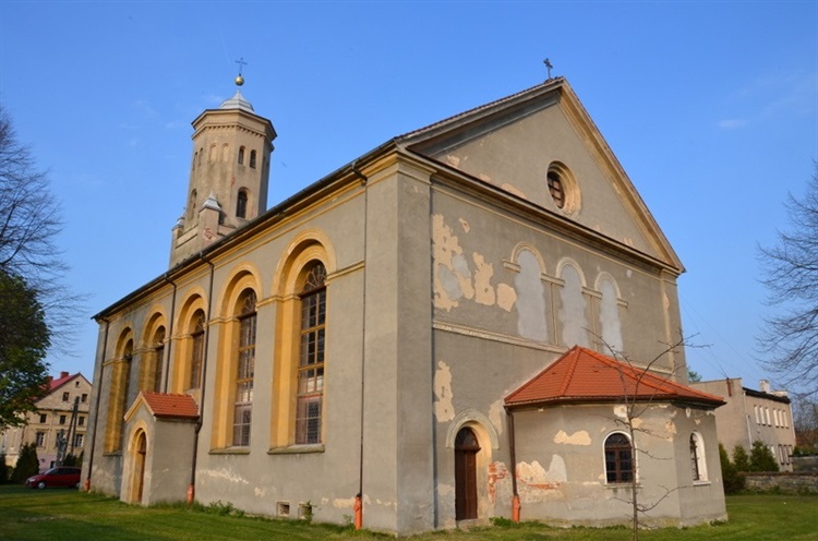 Kościół Podwyższenia Krzyża Świętego został wzniesiony prawdopodobnie w XIX wieku. Wzniesiony jest na planie prostokąta, jest murowany, otynkowany i nakryty dwuspadowym dachem. Do nawy przylega kilkukondygnacyjna wieża. Pierwsza część wieży (dolna) zbudowana jest na rzucie kwadratu, a druga na rzucie ośmioboku. Po przeciwnej stronie nawy i prezbiterium dobudowana jest wieloboczna zakrystia.