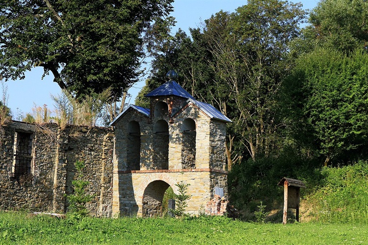 Dzwonnica wolnostojąca, murowana z kamienia, parawanowa, z trzema łukowymi wnękami na dzwony na wysokości pierwszej kondygnacji. Na dole większy łuk pełniący funkcję bramy wejściowej. Dach pokryty jest blachą i zwieńczony cebulastą kopułką z krzyżem. W 2009 roku zabytkowy obiekt wyremontowano.