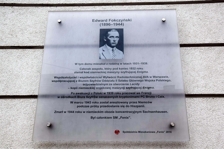 Tablica znajdująca się na budynku przy placu Wilsona 4 od strony ulicy Mickiewicza. Odsłonięta z inicjatywy Spółdzielni Mieszkaniowej „Fenix” w 2014 roku. Upamiętnia Edwarda Fokczyńskiego, który mieszkał tu wraz z rodziną w latach 1931-39. Był on członkiem 15-sto osobowego zespołu, który w 1932 roku złamał kod niemieckiej maszyny szyfrującej Enigma.