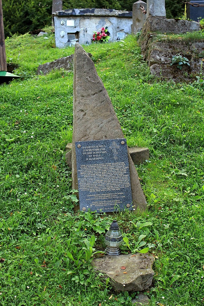 Obelisk upamiętniający dawnych mieszkańców stoi pomiędzy cerkwią pod wezwaniem Zaśnięcia Przenajświętszej Bogurodzicy a drewnianą dzwonnicą. Na pomniku zamontowano płytę upamiętniającą mieszkańców wysiedlonych w 1945 roku. Na płycie widnieją nazwiska ukraińskich rodzin mieszkających w Szczawnem do 1945 roku. Kamienny pomnik z tablicą został odsłonięty 28 sierpnia 2009 roku.