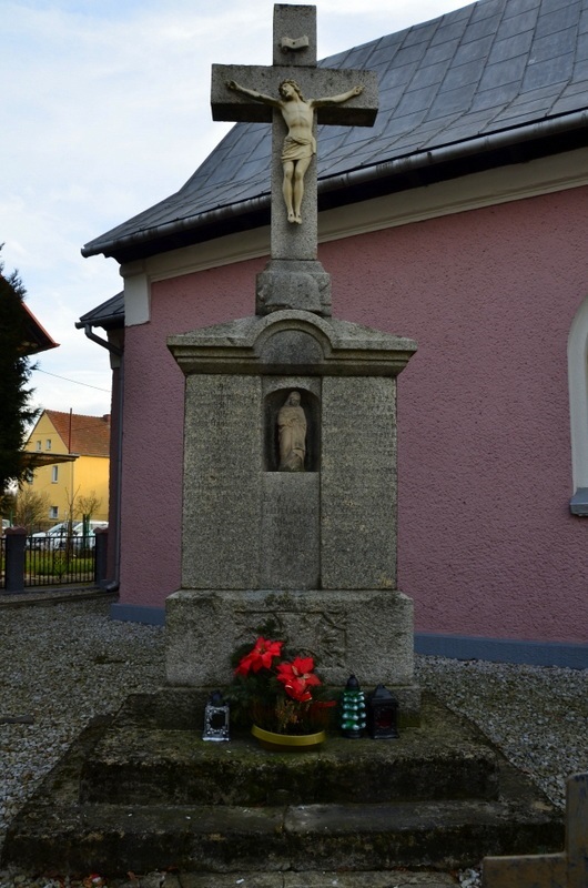 Jest to krzyż z figurą ukrzyżowanego Chrystusa wieńczący cokół, w którym w niewielkiej wnęce stoi figurka Matki Boskiej Bolesnej. W postumencie umieszczone są motywy militarne i są to: relief hełmu żołnierskiego w stopce, na której stoi krzyż i na podstawie cokołu relief Krzyża Żelaznego (Eisernes Kreuz) – najwyższego niemieckiego odznaczenia wojskowego leżącego na gałązkach dębu i wawrzynu. Na cokole pod figurką MB wyryta jest inskrypcja informująca komu pomnik jest poświęcony oraz po bokach wyryte są nazwiska poległych.