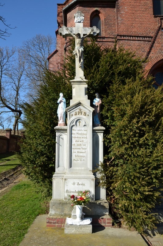 Krzyż – Boża Męka stoi przed kościołem pw. Wniebowzięcia NMP. Podstawa i cokół z wieńczącym go krzyżem postawiony jest na dwustopniowym podwyższeniu ceglano-betonowym. W płycinach podstawy i cokołu wyryte są inskrypcje oraz data – marzec 10.39. U stóp krzyża stoją dwie figury: z lewej strony Matka Boska i z prawej św. Jan Ewangelista. Krzyż umieszczony na środku cokołu ma ramiona zakończone w koniczynkę. Na krzyżu figura ukrzyżowanego Chrystusa, a nad jego głową poziomy, falowany kartusz INRI.