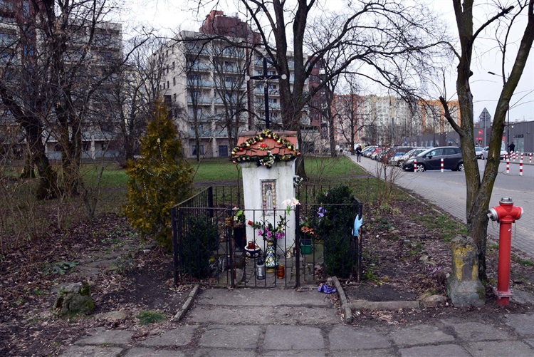Czworoboczna kapliczka przydrożna zwieńczona wysokim żelaznym krzyżem z Pasyjką, znajdująca się przy ulicy Wolumen róg Wergiliusza w warszawskiej dzielnicy Bielany. W niewielkiej, prostokątnej wnęczce figurka Najświętszej Maryi Panny.