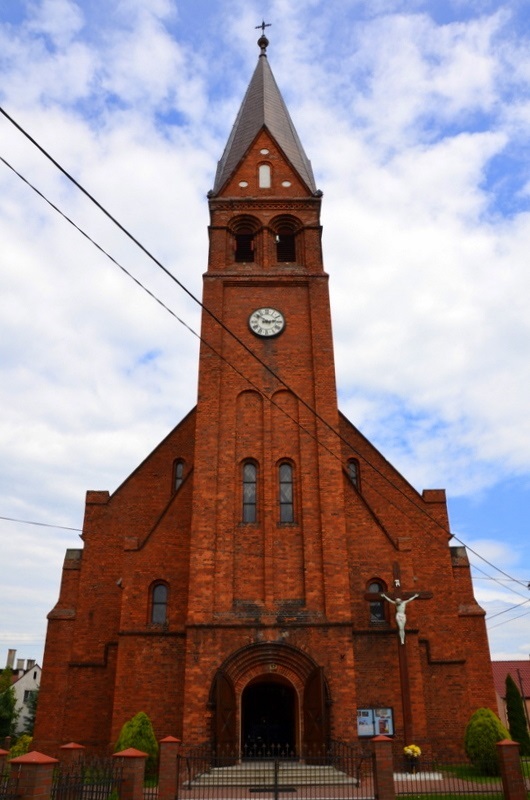 Kościół zbudowany jest z czerwonej cegły na planie prostokąta z węższym prezbiterium zamkniętym absydą. Nawa i prezbiterium wzmocnione przyporami. Od frontu do nawy przylega kilkukondygnacyjna wieża z zegarem. Nawa święty i prezbiterium przykryte są dachami dwuspadowymi krytymi dachówką, a wieża dachem namiotowym zwieńczonym krzyżem.