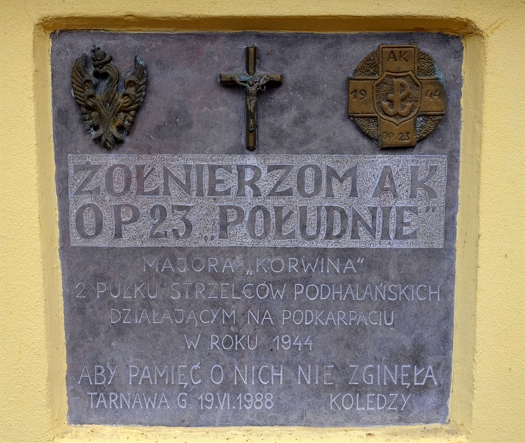 Tablica upamiętnia oddział partyzancki AK o kryptonimie OP-23 zgrupowanie partyzanckie AK, którego dowódcą był kpt. Adam Winogrodzki ps. „Korwin”. Tablica wmurowana jest w ścianę kościoła pw. św. Wojciecha. Na tablicy umieszczono następujący tekst "ŻOŁNIERZOM AK OP "POŁUDNIE" MAJORA "KORWINA" Z PUŁKU STRZELCÓW PODHALAŃSKICH DZIAŁAJĄCYM NA PODKARPACIU W ROKU 1944 / ABY PAMIĘĆ O NICH NIE ZGINĘŁA – KOLEDZY" / TARNAWA G. 19.VI.1988".