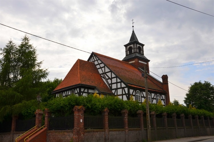 Jest to obecnie świątynia wzniesiona na planie prostokąta z węższym prezbiterium (absydą). Świątynia jest konstrukcji szkieletowej (strona północna, południowa i wschodnia), natomiast strona zachodnia świątyni z wieżą zbudowana jest w surowej cegle. Wyposażenie świątyni to przede wszystkim: drewniany, barokowy ołtarz, ambona z XVII wieku, organy wykonane przez Jana Gottl. Englera z Wrocławia (1796-97) oraz liczne rzeźby i obrazy.