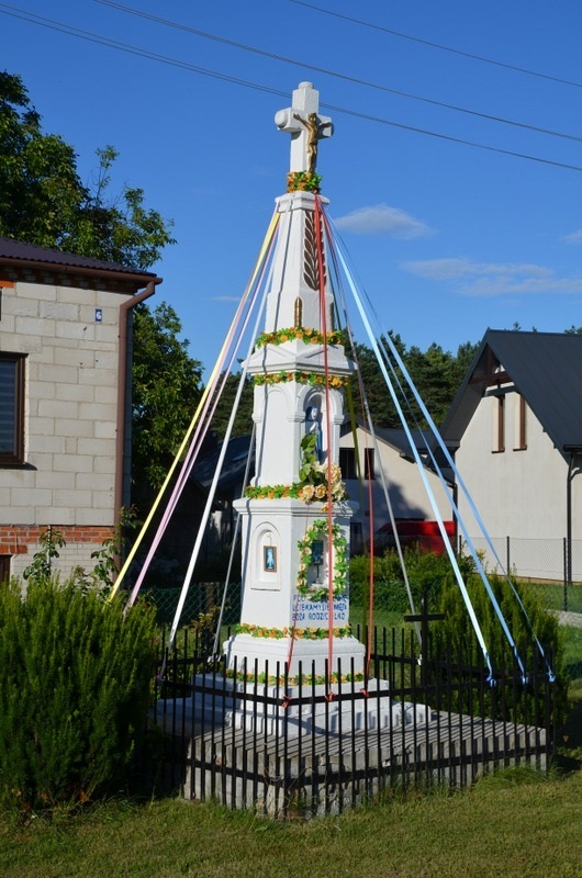 Pierwsza kapliczka stoi za niskim metalowym ogrodzeniem na betonowym podwyższeniu. Na trzyczęściowej podstawie umieszczony jest dwuczęściowy cokół zwieńczony wysoką, zwężającą się ku górze stopką ozdobioną motywem roślinnym. Na stopce stoi mały krzyż z figurką ukrzyżowanego Chrystusa. W pierwszej części cokołu, w płycinach zawieszone są małe obrazy. Pod płyciną od frontu wyryta jest inskrypcja "POD TWOJĄ OBRONĘ UCIEKAMY SIĘ ŚWIĘTA BOŻA RODZICIELKO", a na ścianie bocznej cokołu "BOŻE BŁOGOSŁAW TYCH MIESZKAŃCÓW 1906 R.". W wyższej i węższej części cokołu, w półkoliście zamkniętej wnęce umieszczona jest figurka Matki Bożej. Kapliczka ozdobiona jest sztucznymi kwiatami i wstążkami.
