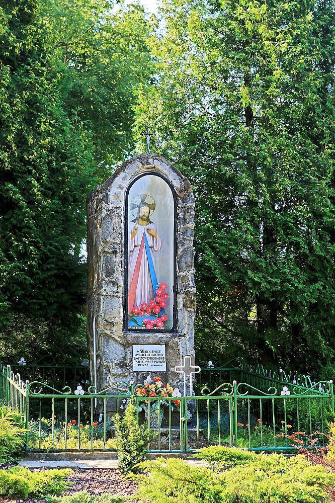 Rzeźba Jezusa Miłosiernego stoi przy drodze prowadzącej do kościoła rzymskokatolickiego pod wezwaniem Matki Bożej Gromnicznej w Porażu. Rzeźba znajduje się w przeszklonej wnęce, w murowanej z kamienia kapliczce. Pod wnęką umieszczono tablicę z napisem: "w 50 rocznicę wybuchu II wojny światowej 1939-1989 poległym z parafii Poraż - parafianie". Kapliczka jest otoczona metalowym ogrodzeniem.