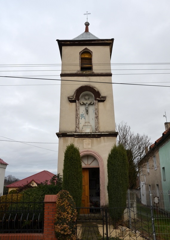 Kaplica zbudowana jest na planie kwadratu, trzykondygnacyjna, murowana i otynkowana. Poszczególne kondygnacje przedzielone są gzymsami biegnącymi wokół obiektu. Kaplica nakryta jest dachem czterospadowym zwieńczonym krzyżem. W elewacji frontowej, w środkowej kondygnacji znajduje się półokrągło zamknięta wnęka zdobiona półokrągłym gzymsem. We wnęce umieszczony jest krzyż z figurą ukrzyżowanego Jezusa Chrystusa. Nad zamkniętym łukiem wejściem do kaplicy wmurowana jest tablica upamiętniająca poległych mieszkańców miejscowości na frontach I wojny światowej. Wewnątrz kaplicy na ścianie nad przyściennym ołtarzykiem wisi krzyż i obrazy o tematyce biblijnej.