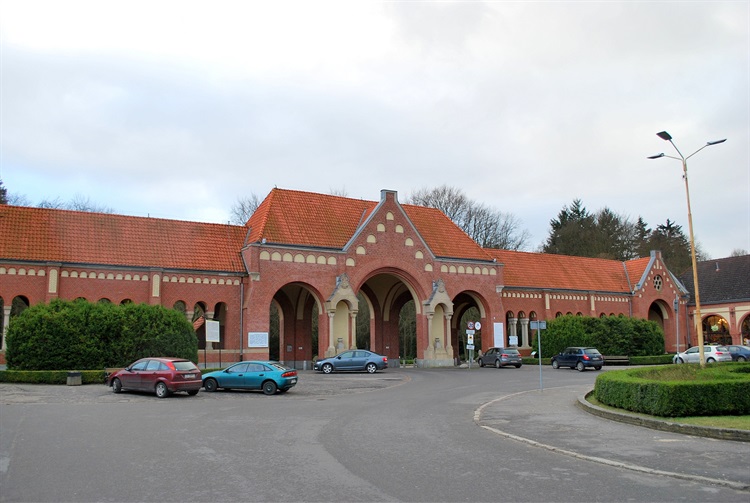 Neoromańska brama ma 77 metrów długości i zwieńczona była pierwotnie kopułą z krzyżem, która została zniszczona przez alianckie lotnictwo w 1941 r. Z prawej strony bramy znalazł się budynek zajmowany przez administrację cmentarza, z lewej zaś pomieszczenia gospodarcze. Obiekty odbudowano po wojennych zniszczeniach w latach 1959-1963. W miejscu budynku gospodarczego wzniesiono nową, utrzymaną w stylu całości kaplicę cmentarną.