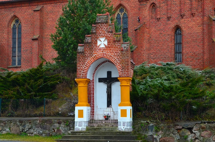 Wnęka ujęta została arkadą wspartą na dwóch masywnych tynkowanych kolumnach, które ustawiono na cokołach z prostokątnymi płycinami na wykonanej z kamienia polnego podmurówce. W schodkowym szczycie kapliczki płycina w kształcie Krzyża Żelaznego ale główną ozdobą odgrodzonej niskim metalowym płotkiem części frontowej jest sporych rozmiarów i dobrze zachowany krucyfiks.