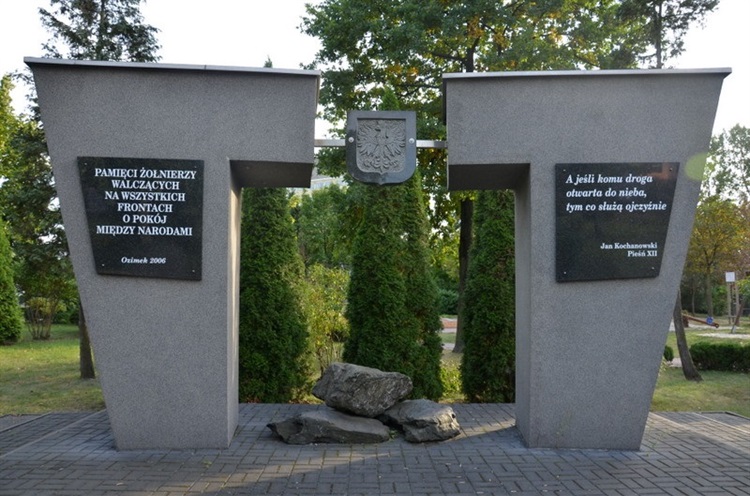 Pomnik upamiętniający żołnierzy walczących na frontach stoi na placu Wolności. Postument stoi na dwustopniowym wybrukowanym podwyższeniu. Pomnik tworzą dwie oddzielne bryły połączone godłem Polski. Na jednym elemencie umieszczony jest napis "PAMIĘCI ŻOŁNIERZY WALCZĄCYCH NA WSZYSTKICH FRONTACH O POKÓJ MIĘDZY NARODAMI – Ozimek 2006" i na drugim elemencie "A jeśli komu droga otwarta do nieba, tym co służą ojczyźnie – Jan Kochanowski - Pieśń XII".