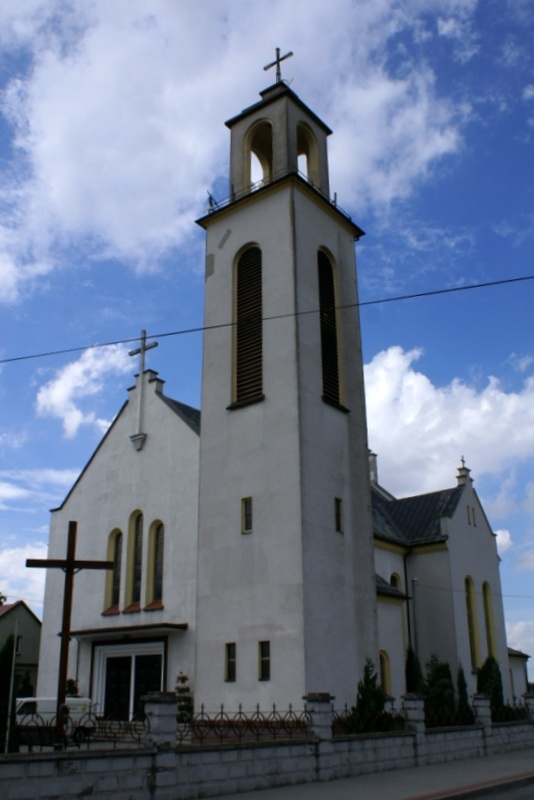 Pierwszy drewniany kościół został tu wzniesiony w 1641 roku. Obecny kościół to współczesny obiekt zbudowany w latach 1957 – 1959 wg projektu inż. Wiktora Majwalda z Wodzisławia. 13 października 1957 roku położono kamień węgielny pod jego budowę. Poświęcenie świątyni miało miejsce 30 sierpnia 1959 r. Kościół jest murowany, trójnawowy, o cechach neoromańskich. Nakryty jest dwuspadowym dachem. Od frontu, z boku, do świątyni przylega kilkukondygnacyjna wieża. Wyposażenie jego wnętrza jest współczesne. Na uwagę zasługują witraże oraz figury świętych.