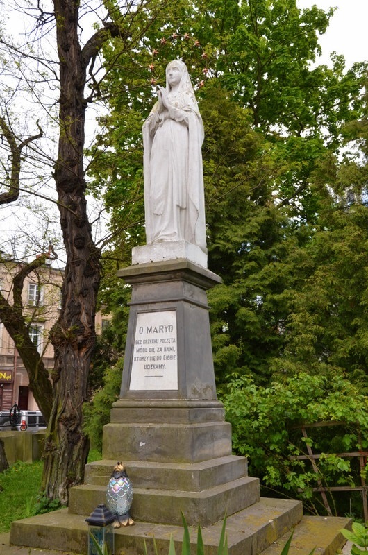 Na ścianie frontowej cokołu wyryta jest kolejna inskrypcja zwracająca się bezpośrednio do MB "O MARYJO BEZ GRZECHU POCZĘTA / MÓDL SIĘ ZA NAMI / KTÓRZY SIĘ DO CIEBIE UCIEKAMY". Biała rzeźba Matki Bożej wieńczy cokół posadowiony na kilkustopniowej podstawie. MB przedstawiona jest z gwieździstą aureolą nad głową i dłońmi złączonymi do modlitwy.