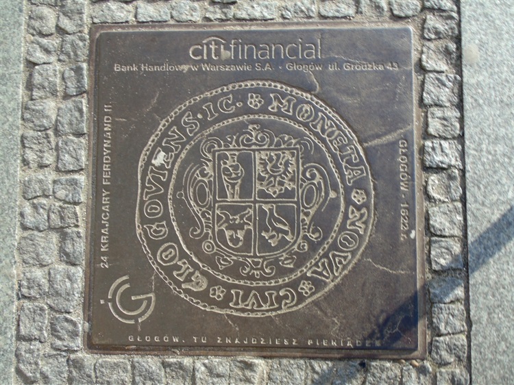 Zmierzając ulicą Grodzką na nowej Starówce w Głogowie warto pochylić głowę i zwrócić uwagę na oryginalną reklamę banku. Są nią odlane w metalu płyty wkomponowane w chodnik. Widnieją na nich wizerunki monet bitych w Głogowie.