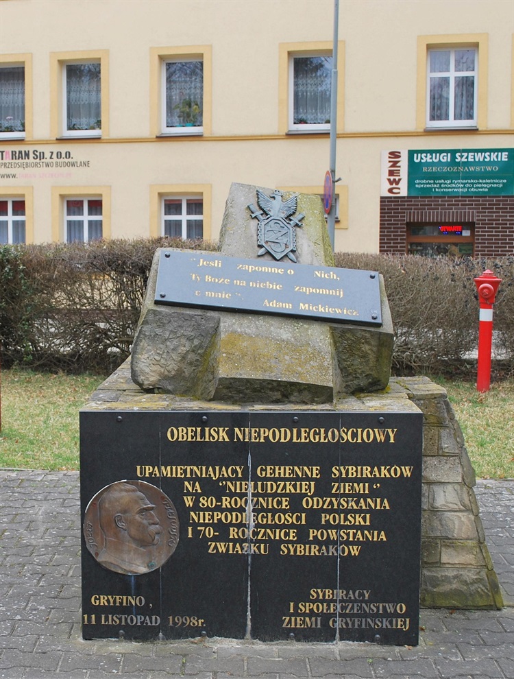 11 listopada 1998 r. na placu Pamięci Sybiraków w Gryfinie odsłonięto pomnik upamiętniający 80 rocznicę odzyskania przez Polskę niepodległości, będący jednocześnie hołdem dla syberyjskich zesłańców. Na tablicy z wizerunkiem marszałka Józefa Piłsudskiego znalazł się napis "Obelisk Niepodległościowy upamiętniający gehennę Sybiraków na "nieludzkiej ziemi" w 80-rocznice odzyskania niepodległości i 70-rocznicę powstania Związku Sybiraków. Sybiracy i społeczeństwo Ziemi Gryfińskiej". Na postumencie znajduje się kamienny krzyż z tablicą z cytatem z Adama Mickiewicza "Jeśli zapomnę o Nich, Ty Boże na niebie zapomnij o mnie".
