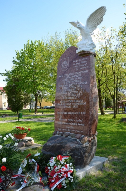 Pomnik upamiętniający pacyfikację Wąwolnicy stoi w centrum miejscowości. Jest to granitowa płyta posadowiona na kamiennej podstawie leżącej na betonowym podłożu. Płyta zwieńczona jest sylwetką białego orła. Pod orłem widnieje myśl św. Jana Pawła II "Droga do jedności to droga dialogu, a nie przemocy". W górnej części płyty umieszczony jest herb Wąwolnicy, a poniżej inskrypcja informująca komu pomnik jest poświęcony.
