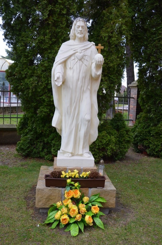 Figura Chrystusa Króla stoi przed kościołem pw. św. Marcina, wzniesionym w latach 1908-1914. Jest to współczesna biała rzeźba stojąca na dwustopniowej, murowanej z obrobionego kamienia podstawie. Chrystus przedstawiony jest z koroną cierniową na głowie i jabłkiem królewskim z krzyżem w lewej ręce. W wizerunku tym Chrystus przedstawiony jest z sercem na wierzchu. Serce jest gorejące i promieniuje miłością.