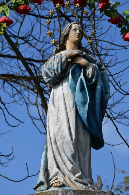 Kolumna usytuowana jest przy bramie wjazdowej na terenie parku dworskiego. Figura Matki Bożej stoi na głowicy ośmiobocznej kolumny ustawionej na betonowej podstawie w centrum okrągłej rabaty kwiatowej. Matka Boża nakryta jest niebieską szatą z rękami przy piersi, głową skierowana ku niebu, a nad głową umieszczoną ma gwiezdną aureolę. Figura stoi wewnątrz arkady wykonanej z metalowego pręta ozdobionego sztucznymi kwiatami.