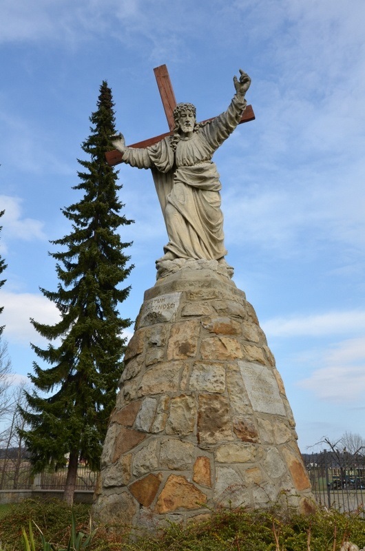 Figura Pana Jezusa znajduje się przed kościołem pw. Matki Boskiej Pocieszenia i św. Marcina. Wzniesiona została w 1934 r. Pan Jezus dźwigający krzyż wieńczy murowaną z kamienia na planie koła podstawę. Na kamieniu w górnej części podstawy wyryty jest napis o treści "WOTUM WDZIĘCZNOŚCI 1934" oraz w środkowej części podstawy "KTO CHCE IŚĆ ZA MNĄ NIECH WEŹMIE KRZYŻ I NAŚLADUJE MNIE". Postument otoczony jest niskim murowanym z kamienia ogrodzeniem.