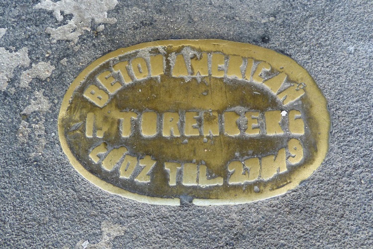 Przyglądając się podłożu można dostrzec kolorowe, wytłaczane „płyty”, które wykonał Torenberg i „opieczętował” swoją metalową wizytówką. W dostępnych mi źródłach nic nie odnalazłem na temat firmy Torenberga. Jedynie natknąłem się na tak samo brzmiącą nazwę przedsiębiorstwa brukarskiego „BETON-AMERICAN” należącego do L. Tornberga i Syna i mieszczącego się niegdyś w Łodzi w Pasażu Szulca 75 (obecnie Al. 1 Maja), tel. 25-85.