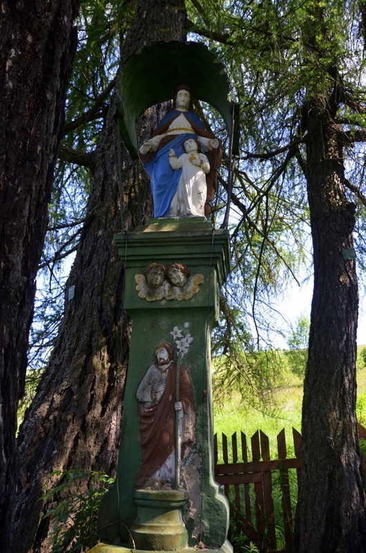 Figury wieńczą wysoki, zwężający się ku górze cokół posadowiony na niskiej podstawie. Na podstawie wyryta jest data – 1889, rok postawienia postumentu. Postacie Matki Bożej i Dzieciątka stoją na rozbudowanym gzymsie cokołu zdobionym główkami putt. Matka Boża przedstawiona jest w białej sukni przepasanej sznurem, długim niebieskim płaszczu i koroną na głowie. Opuszczone i rozstawione ręce trzyma nad małym Jezusem stojącym u jej stóp. Dzieciątko prawą rączkę ma uniesioną do góry w formie błogosławieństwa, a lewą trzyma na sercu.