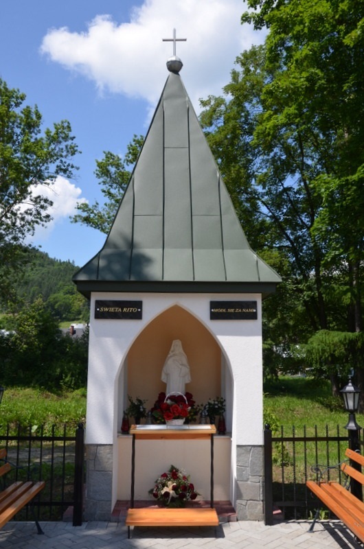 Kapliczka poświęcona 2017 r. stoi w pobliżu kościoła pw. św. Bartłomieja. Kapliczka jest murowana na planie kwadratu, otynkowana i nakryta czterospadowym dachem zwieńczonym krzyżem na kuli. W ścianach bocznych wykonane są po dwa otwory okienne zamknięte ostrym łukiem i zdobione witrażami, a od frontu wejście do kapliczki zakończone jest również ostrym łukiem. Nad wejściem umieszczone są dwie tablice o treści: jedna "ŚWIĘTA RITO" i druga "MÓDL SIĘ ZA NAMI".