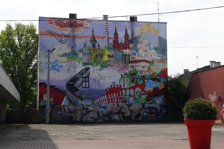 Mural znajduje się na ścianie bocznej budynku stojącego pomiędzy S.D.H. „Trzy Korony” a Urzędem Miejskim (ul. Zamkowa 16). Autor malowidła (A. R.) zgromadził na nim symbole miasta oraz jego najważniejsze budynki związane z jego historią.