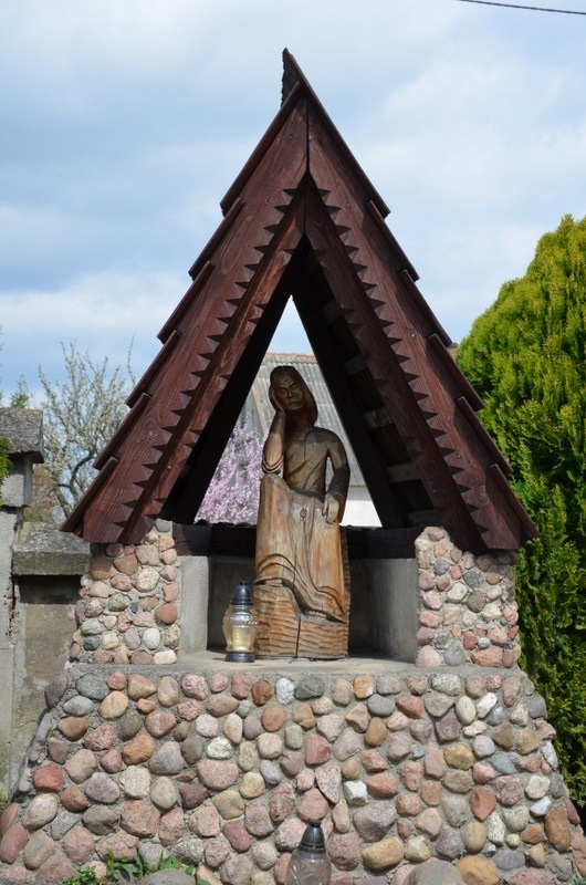 Współczesna kapliczka stoi przy murze na terenie cmentarza przykościelnego obok wysokiego drewnianego krzyża. Betonowa podstawa obłożona kamieniami polnymi nakryta jest dwuspadowym gontowym dachem. Węwnatrz umieszczona jest ludowa, drewniana figura Chrystusa Frasobliwego.