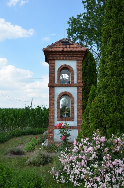 Kapliczka słupowa wzniesiona jest na planie kwadratu, dwukondygnacyjna i nakryta jest czterospadowym dachem z ozdobnym metalowym krzyżem na szczycie. Poszczególne kondygnacje kapliczki oddzielone są od siebie występem z cegieł. Krawędzie ścian zdobione czerwona cegłą. W elewacji frontowej i ścianach bocznych łukowo zwieńczone otwory okienne obramowane warstwą cegieł. Najniższa część kapliczki posiada pełne ściany zdobione krzyżami wykonanymi z wysuniętych cegieł. W przeszklonych wnękach kapliczki umieszczone są: w niższej figura Matki Bożej i w wyższej wnęce krzyż z figurką ukrzyżowanego Chrystusa.