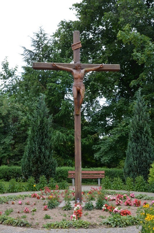 Krzyż- Boża Męka stoi na terenie kościoła pw. św. Wojciech Biskupa Męczennika. Jest to współczesny, prosty, wysoki, drewniany krzyż z figurą ukrzyżowanego Pana Jezusa. Figura Chrystusa z nałożoną na głowie koroną cierniową wykonana jest z drewna. Na szczytowej belce krzyża nad wizerunkiem Chrystusa umieszczony jest titulus - tabliczka z napisem INRI (skrót od łacińskiego: Iesus Nazarenus Rex Iudaeorum - Jezus Nazarejczyk Król Żydowski).
