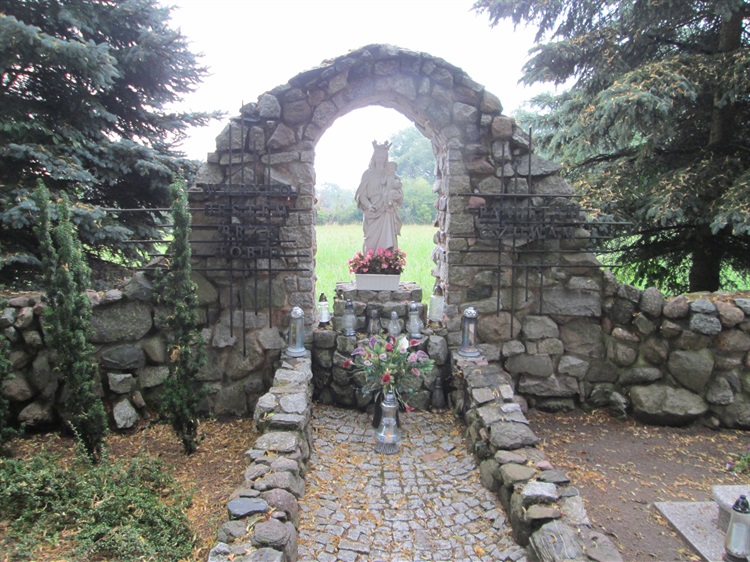 Na cmentarzu parafialnym przy kościele p.w. Najświętszej Maryi Panny i Wszystkich Świętych znajduje się grota z figurą Matki Boskiej. Zbudowana jest z kamienia polnego. Biała figura przedstawia świętą w koronie z dzieciątkiem na lewym przedramieniu. Na grocie dostrzec możemy metalowe kraty z napisem: „Maryjo, jestem przy Tobie, pamiętam, czuwam”.