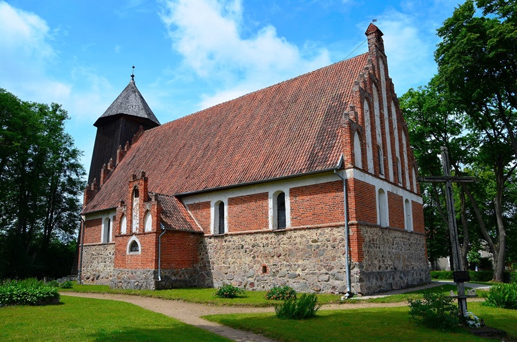 Kościół wybudowano w stylu późnogotyckim, salowy, murowany do połowy wysokości z kamienia polnego a powyżej ław okiennych i w narożach z cegły. Świątynia jest orientowana wzniesiono ją na rzucie prostokąta z zakrystią od północy i kruchtą od południa. Wspomnianą wieżę natomiast wybudowano po stronie zachodniej, jest ona dwukondygnacyjna drewniana o konstrukcji słupowej i oszalowana deskami, wzniesiono ją na rzucie kwadratu ze ścianami nachylonymi ku górze. Na szczyt wieży umieszczono chorągiewkę z datą 1870 a na sygnaturce wieńczącej szczyt wschodni znajduje się chorągiewka z rokiem 1857, są to lata kolejny prac restauracyjnych.