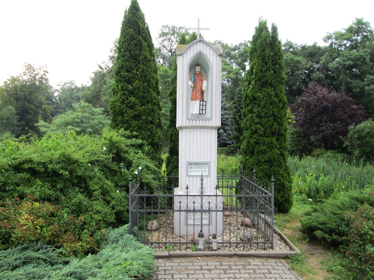Święty przedstawiony jest w sposób tradycyjny. W prawej ręce trzyma gałązkę palmy jako symbol swego męczeństwa, natomiast w lewej kratę (ruszt), na której był męczony. Święty Wawrzyniec zmarł śmiercią męczeńską 10 sierpnia 258 w Rzymie. Czczony jest jako patron ubogich, piekarzy, kucharzy, bibliotekarzy. Chroni od pożarów i pomaga w chorobach reumatycznych i w poparzeniach.