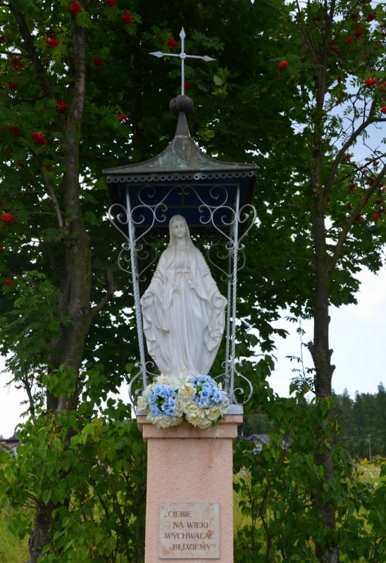 Figura Matki Boskiej jest nowa. Została postawiona w 1995 r., ale stoi na miejscu poprzedniej, zniszczonej od uderzenia pioruna. Osłonięta jest czterospadowym blaszanym daszkiem zwieńczonym krzyżem. Gipsowa figura Matki Boskiej Niepokalanego Poczęcia z rozłożonymi rękami i otwartymi dłońmi zwrócona jest w stronę widocznego z oddali klasztoru klarysek w Starym Sączu.