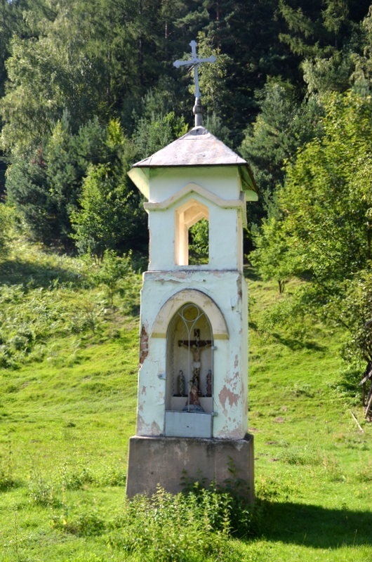 Kapliczka stoi na terenie prywatnej posesji. Wzniesiona jest na planie kwadratu z poszerzoną podstawą, nad którą wznoszą się dwie kondygnacje. Większa pierwsza kondygnacja zawiera wnękę zakończoną ostrym łukiem. Wewnątrz umieszczona jest kompozycja rzeźbiarska przedstawiająca Bożą Mękę – Ukrzyżowany Chrystus i pod krzyżem postacie Matki Boskiej Bolesnej i św. Jana Ewangelisty. Poniżej umieszczona została figurka Chrystusa Frasobliwego. Górna mniejsza kondygnacja wykonana jest w formie latarni nakrytej czterospadowym daszkiem i krzyżem na szczycie.