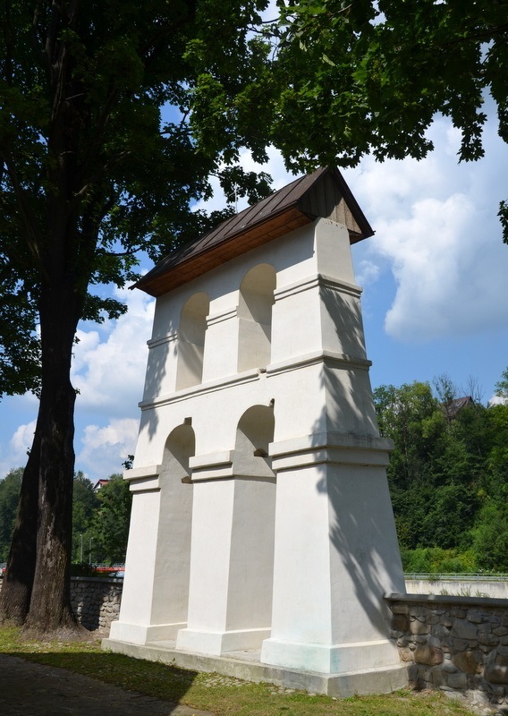 Wolno stojąca dzwonnica wkomponowana jest w mur otaczający teren kościoła pw. św. Mikołaja. Jest znacznie młodsza od kościoła, gdyż zbudowana została na przełomie XVIII/XIX wieku. Dzwonnica jest obiektem dwukondygnacyjnym, murowanym na planie prostokąta ze ścianami zwężającymi się ku górze i nakryta dwuspadowym dachem. Posiada arkadowe otwory, w których zawieszone były trzy dzwony wykonane w znanej odlewni dzwonów Felczyńskich w Przemyślu. Najstarszy dzwon noszący imię Mikołaj wykonany został w 1949 r., a dwa mniejsze noszące imiona Maryja i Józef wykonane zostały w 1966 r. Obecnie dzwonnica pozbawiona jest dzwonów, które zapewne zostały przeniesione do nowej dzwonnicy wzniesionej przy kościele Miłosierdzia Bożego.