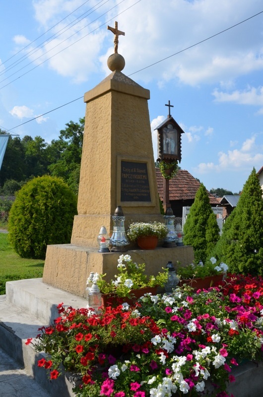 Obelisk upamiętniający świętego Stanisława Papczyńskiego został postawiony w 1934 r. Stoi w miejscu gdzie w przeszłości znajdował się jego dom rodzinny. Obelisk wykonany z piaskowca jest posadowiony na kilkustopniowej podstawie i zwieńczony krzyżem na kuli. W ścianie frontowej wmurowana jest tablica o treści "Czcig. sł. B. Stanisł. PAPCZYŃSKIEMU 18.5.1631 – 17.9.1701 Założycielowi XX. Marianów Teolog i Kapel. W. P. Kr. Sobieskiego – w miejscu rodzinnem – 1934". Obok postawiona została tablica, na której umieszczona została "Ustawa Sejmu Koronnego Króla Stanisława Augusta Poniatowskiego z 1764 r. z petycją do Stolicy Apostolskiej o beatyfikację O. Stanisława Papczyńskiego" i "Uchwała Senatu Rzeczpospolitej Polskiej z dnia 31 marca 2011 r. dla uczczenia postaci i dokonań Błogosławionego Ojca Stanisława Papczyńskiego".