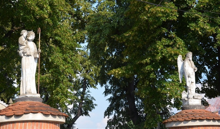 Dwie rzeźby znajdują się przed kościołem pw. św. Jana Chrzciciela. Rzeźby wieńczą duże okrągłe słupy bramy murowane z kamienia. Słupy w górnej części ozdobione są czerwoną cegłą i zwieńczone gzymsem i daszkiem krytym dachówką. Na słupach tych stoją dwie rzeźby: jedna rzeźba to święty Józef z Dzieciątkiem na prawej ręce, druga rzeźba przedstawia św. Michała Archanioła depczącego szatana w postaci smoka.