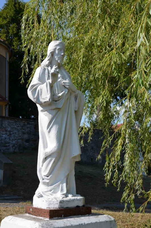 Rzeźba Pana Jezusa stoi przed kościołem na niskim cokoliku podstawionym na dużych rozmiarów betonowej podstawie. Cokolik wieńczy figura Pana Jezusa. W wizerunku tym Pan Jezus przedstawiony jest z gorejącym sercem na wierzchu i lewą dłonią dotykającą jego dolną część, prawa ręka uniesiona w formie błogosławieństwa. Na tylnej ścianie cokolik wyrytą miał inskrypcję w języku niemieckim. Niestety inskrypcja została zniszczona po II wojnie światowej.