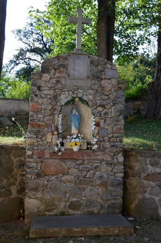 Kapliczka stoi naprzeciwko wejścia do kościoła pw. Wniebowzięcia NMP. Jest to obiekt murowany z kamienia i zwieńczony krzyżem. W ścianie frontowej wykonana jest wnęka zakończona ostrym łukiem. Wewnątrz otwartej wnęki umieszczona jest współczesna figurka Matki Bożej Różańcowej. Powyżej wnęki, na prostokątnej płycie wyryta jest inskrypcja w języku niemieckim.